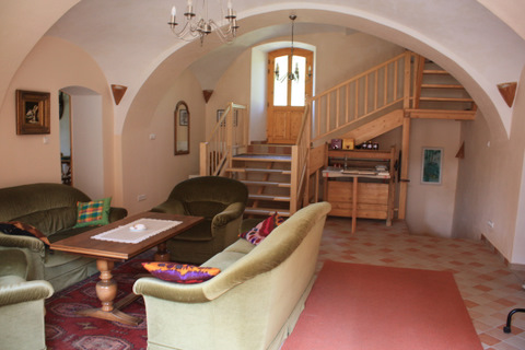 Während sich die beiden angebotenen Ferienwohnungen im 1. Stock des Nebenhauses befinden, wurden im Erdgeschoß einige Räume zur gemeinschaftlichen Nutzung eingerichtet. Insbesondere sind dies der große und gemütlich eingerichtete Empfangsbereich und die gemeinsame Waschküche.